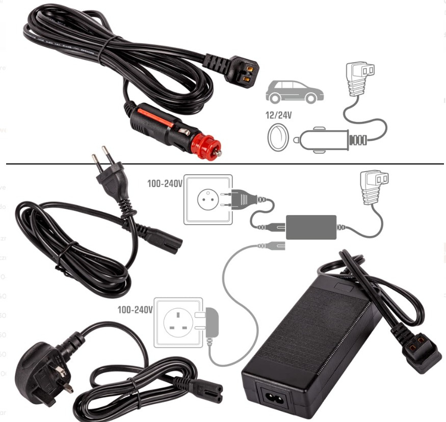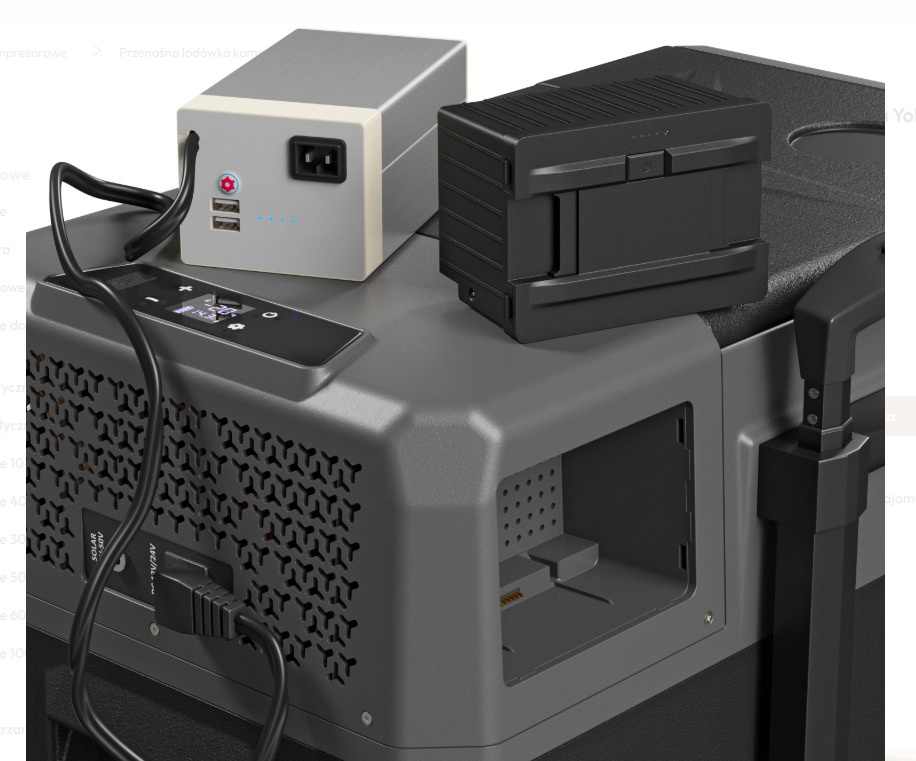 Lodówkę możesz podłączyć do gniazdka zapalniczki samochodowej, standardowego gniazda sieciowego lub skorzystać z dedykowanej baterii modułowej Yolco SX4G, Yolco CSX5 lub RSX6.